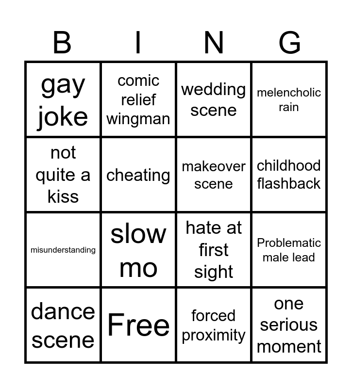 This bingo card has 16 words: Free, Problematic male lead, wedding scene, gay joke, misunderstanding, comic relief wingman, hate at first sight, forced proximity, not quite a kiss, cheating, dance scene, melencholic rain, slow mo, childhood flashback, makeover scene and one serious moment.