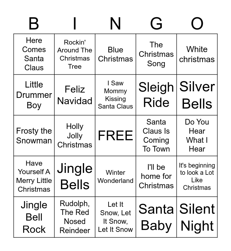 This bingo card has a free space and 24 words: Jingle Bells, Rudolph, The Red Nosed Reindeer, I Saw Mommy Kissing Santa Claus, Jingle Bell Rock, White christmas, Here Comes Santa Claus, Little Drummer Boy, Rockin' Around The Christmas Tree, Santa Claus Is Coming To Town, Winter Wonderland, Sleigh Ride, Frosty the Snowman, I'll be home for Christmas, It's beginning to look a Lot Like Christmas, Feliz Navidad, Santa Baby, Do You Hear What I Hear, Blue Christmas, Silver Bells, Holly Jolly Christmas, Silent Night, Have Yourself A Merry Little Christmas, The Christmas Song and Let It Snow, Let It Snow, Let It Snow.