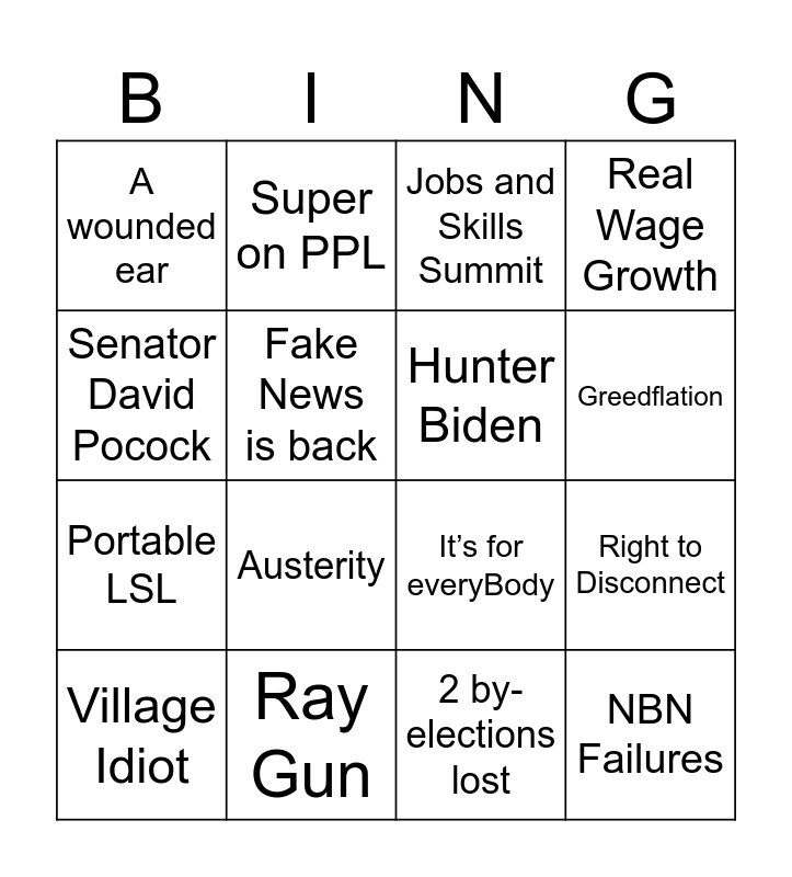 ⚠ This card has duplicate items: NBN Failures (2), Wicked (2), Fake News is back (2), Steven Miles (2), A wounded ear (2), ACT be ALP 4 EVA (2), Village Idiot (2), Housing crisis (2), Go back to the office (2), Community capacity to pay (2), Hunter Biden (2), Drag Story Time (2), Ray Gun (2), 9.2% (2), Mexican Presidenta (2), Julian Assange (2), Norwegian Electric Cars (2), Tupperware (2), The Return of the Sausages (2), 2 by-elections lost (2), Same Job Same Pay (2), Closing Loopholes (2), Elon Musk (2), Youth workers (2), $21.4 Million (2), Portable LSL (2), Super on PPL (2), It’s for everyBody (2), Right to Disconnect (2), Royal Commission into DFSV (2), Sleepover Pay (2), Delegate's Rights (2)