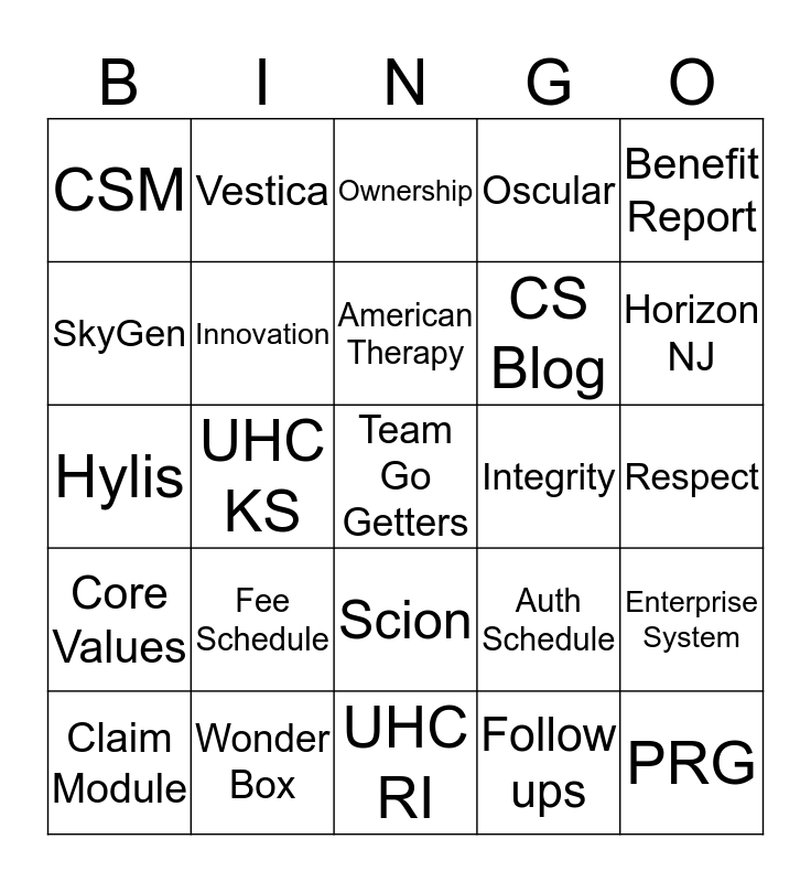 This bingo card has a free space and 24 words: Fee Schedule, Wonder Box, American Therapy, Claim Module, Benefit Report, CSM, SkyGen, Vestica, Integrity, Scion, CS Blog, Hylis, Auth Schedule, Enterprise System, Innovation, Follow ups, Respect, Ownership, Horizon NJ, UHC KS, PRG, Core Values, Oscular and UHC RI.