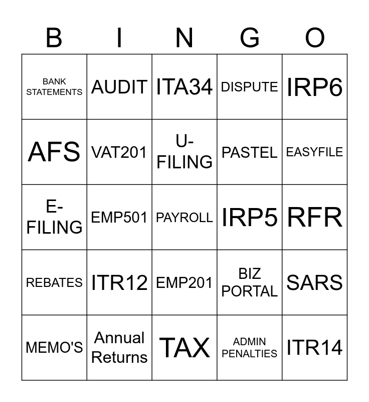 This bingo card has a free space and 24 words: ITR12, Annual Returns, U-FILING, MEMO'S, IRP6, BANK STATEMENTS, AFS, AUDIT, IRP5, EMP201, PASTEL, E- FILING, BIZ PORTAL, SARS, VAT201, ADMIN PENALTIES, RFR, ITA34, EASYFILE, EMP501, ITR14, REBATES, DISPUTE and TAX.