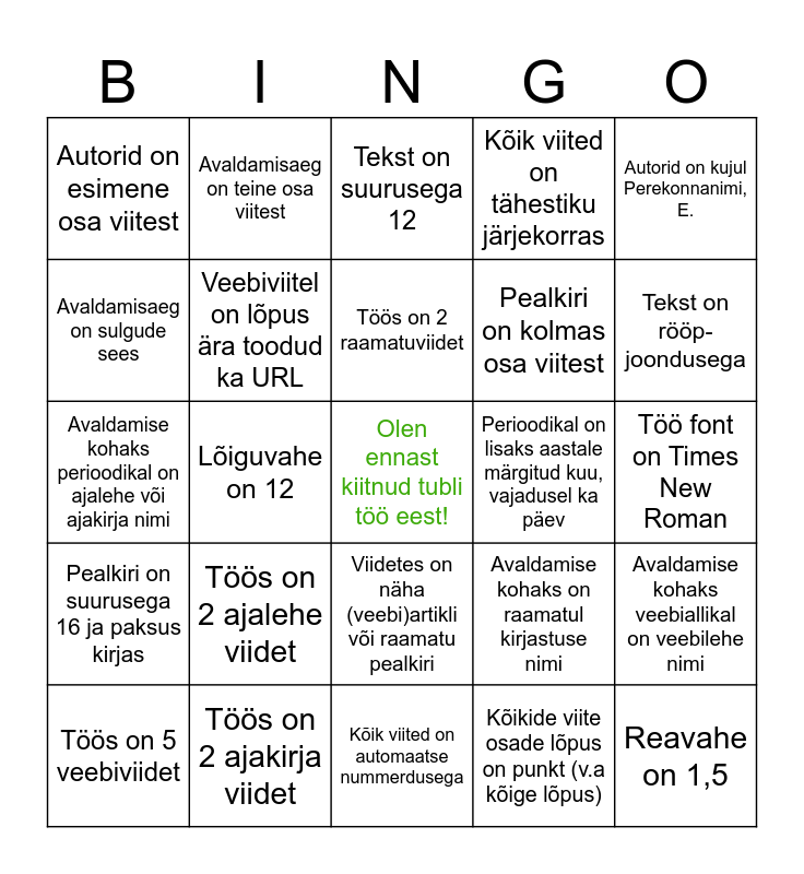 This bingo card has a free space and 24 words: Töös on 2 ajalehe viidet, Töös on 2 ajakirja viidet, Töös on 2 raamatuviidet, Töös on 5 veebiviidet, Autorid on kujul Perekonnanimi, E., Autorid on esimene osa viitest, Avaldamisaeg on sulgude sees, Avaldamisaeg on teine osa viitest, Perioodikal on lisaks aastale märgitud kuu, vajadusel ka päev, Viidetes on näha (veebi)artikli või raamatu pealkiri, Pealkiri on kolmas osa viitest, Avaldamise kohaks perioodikal on ajalehe või ajakirja nimi, Avaldamise kohaks on raamatul kirjastuse nimi, Avaldamise kohaks veebiallikal on veebilehe nimi, Veebiviitel on lõpus ära toodud ka URL, Kõikide viite osade lõpus on punkt (v.a kõige lõpus), Töö font on Times New Roman, Tekst on suurusega 12, Tekst on rööp-joondusega, Lõiguvahe on 12, Reavahe on 1,5, Pealkiri on suurusega 16 ja paksus kirjas, Kõik viited on tähestiku järjekorras and Kõik viited on automaatse nummerdusega.