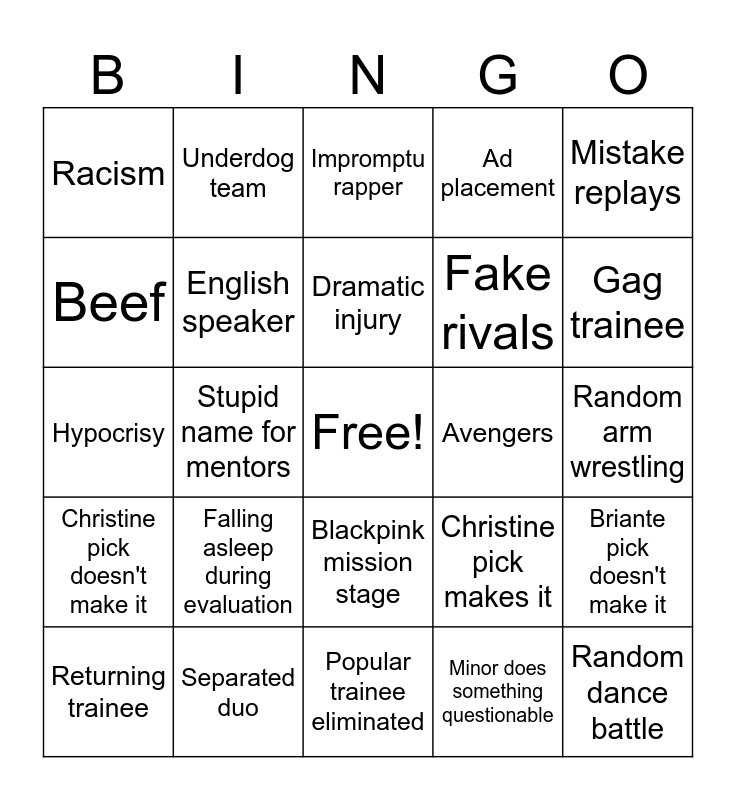 This bingo card has a free space and 43 words: Call home, Random dance battle, Popular trainee is bad, Returning trainee, Popular trainee, annoying fandom, Minor does something questionable, Impromptu rapper, Voice crack, Mistake replays, Separated duo, Ad placement, Avengers, Blackpink mission stage, Falling asleep during evaluation, Jay Park says something cringey, Popular trainee eliminated, Mentor says something dumb, Hypocrisy, Below expectations, Gag trainee, Underdog team, Evil edit, Perfect team.... except., Racism, Original audition videos, Random arm wrestling, Sky pick makes it, Sky pick doesn't make it, Christine pick makes it, Christine pick doesn't make it, Briante pick makes it, Briante pick doesn't make it, Popular trainee traded out, Stupid name for mentors, Stupid name for fans, Over-highlighting past career, Xenophobia, Dramatic injury, Beef, Fake rivals, Former actor, English speaker and Random dance break.