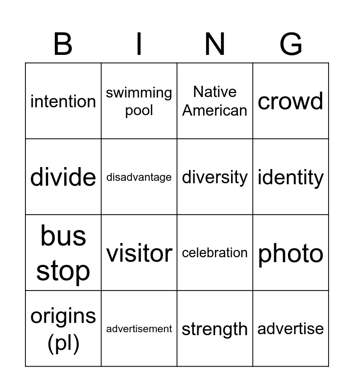 This bingo card has 28 words: Free!, Asian, bus stop, Chinatown, disadvantage, Native American, swimming pool, advertise, advertisement, celebrate, celebration, crowd, taxi, toilet, visitor, beginner, coach, diversity, identity, integrate, intention, native country, origins (pl), photo, strength, contribution, divide and equal.