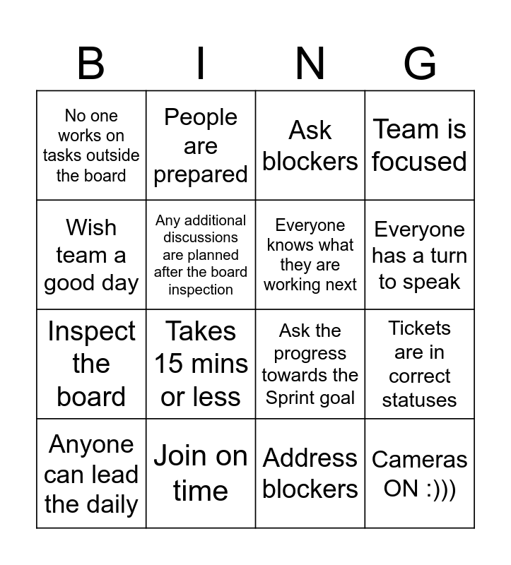 This bingo card has 16 words: Join on time, Tickets are in correct statuses, Ask blockers, No one works on tasks outside the board, Inspect the board, People are prepared, Ask the progress towards the Sprint goal, Address blockers, Wish team a good day, Any additional discussions are planned after the board inspection, Anyone can lead the daily, Team is focused, Takes 15 mins or less, Everyone has a turn to speak, Everyone knows what they are working next and Cameras ON :))).
