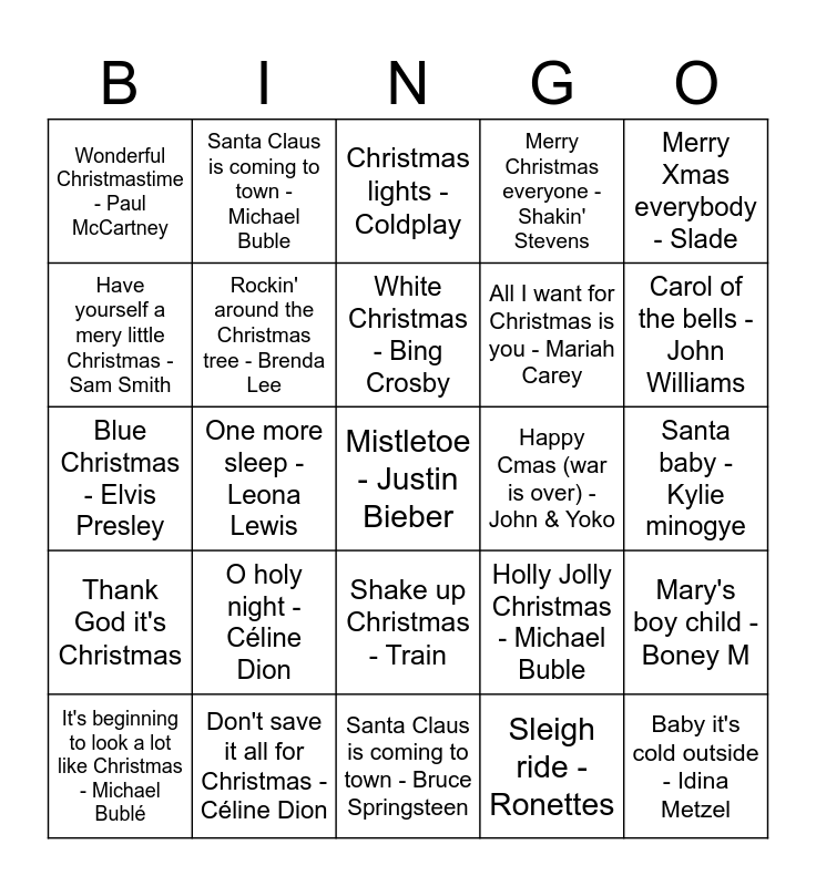 This bingo card has 55 words: Jingle Bell Rock - Bobby Helms, It's beginning to look a lot like Christmas - Michael Bublé, Last Christmas - Wham, Wonderful Christmastime - Paul McCartney, Santa Claus is coming to town - Bruce Springsteen, The Christmas Song - Nat King Cole, Rockin' around the Christmas tree - Brenda Lee, Happy Xmas - John Lennon, All I want for Christmas is you - Mariah Carey, Fairytale of New York - Pogues, Merry Christmas everyone - Shakin' Stevens, Do they know it's Christmas - Band Aid, Step into Christmas - Band Aid, Santa tell me - Ariana Grande, I wish it could be Christmas everyday - Wizzard, Driving home for Christmas - Chris Rea, Merry Xmas everybody - Slade, One more sleep - Leona Lewis, Underneath the tree - Kelly Clarkson, Mistletoe - Justin Bieber, Happy Cmas (war is over) - John & Yoko, It's the most wonderful time of the year - Andy Williams, Holly Jolly Christmas - Michael Buble, Christmas lights - Coldplay, Jingle bell rock - Bobby Helms, White Christmas - Bing Crosby, Sleigh ride - Ronettes, Let is snow - Dean Martin, Santa baby - Kylie minogye, Mary's boy child - Boney M, Christmas (baby please come home) - Carlene Love, Lonely this Christmas - Mud, 2000 miles - Pretenders, Stop the cavalry - Jona Lewie, Have yourself a mery little Christmas - Sam Smith, Blue Christmas - Elvis Presley, Feliz Navidad - Jose Feliciano, Thank God it's Christmas, Baby it's cold outside - Idina Metzel, Christmas time - Darkness, Santa Claus is coming to town - Michael Buble, Santa's coming for us - Sia, Eenzaam - Bankzitters, Jingle Bells - Frank Sinatra, O holy night - Céline Dion, Don't save it all for Christmas - Céline Dion, Hallelujah - Pentatonix, Snowman - Sia, Happy holiday - Addy Williams, Carol of the bells - John Williams, Winter Wonderland - Tony Bennett, What Christmas means to me - John Legend, I'll be home - Meghan Trainor, Shake up Christmas - Train and My only wish this year - Britney Spears.
