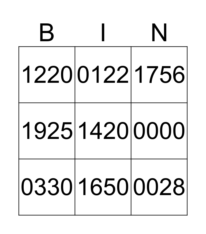 This bingo card has 9 words: 0330, 1756, 0122, 1925, 1220, 0000, 1420, 0028 and 1650.
