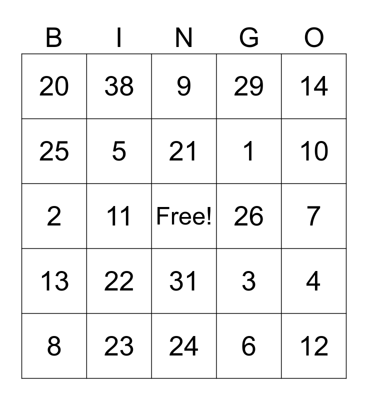 This bingo card has a free space and 24 words: 22, 23, 21, 8, 14, 20, 25, 38, 26, 31, 1, 2, 3, 4, 5, 6, 7, 9, 10, 11, 12, 13, 29 and 24.