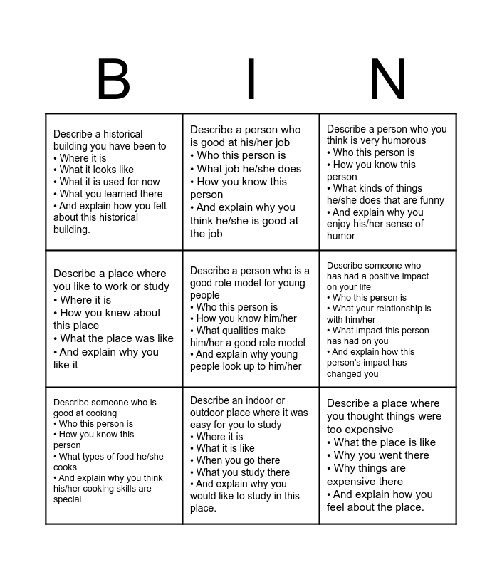 This bingo card has a free space and 8 words: Describe someone who has had a positive impact on your life • Who this person is • What your relationship is with him/her • What impact this person has had on you • And explain how this person’s impact has changed you, Describe a person who you think is very humorous • Who this person is • How you know this person • What kinds of things he/she does that are funny • And explain why you enjoy his/her sense of humor, Describe a person who is good at his/her job • Who this person is • What job he/she does • How you know this person • And explain why you think he/she is good at the job, Describe someone who is good at cooking • Who this person is • How you know this person • What types of food he/she cooks • And explain why you think his/her cooking skills are special, Describe a historical building you have been to • Where it is • What it looks like • What it is used for now • What you learned there • And explain how you felt about this historical building., Describe a place where you thought things were too expensive • What the place is like • Why you went there • Why things are expensive there • And explain how you feel about the place., Describe a place where you like to work or study • Where it is • How you knew about this place • What the place was like • And explain why you like it and Describe an indoor or outdoor place where it was easy for you to study • Where it is • What it is like • When you go there • What you study there • And explain why you would like to study in this place..