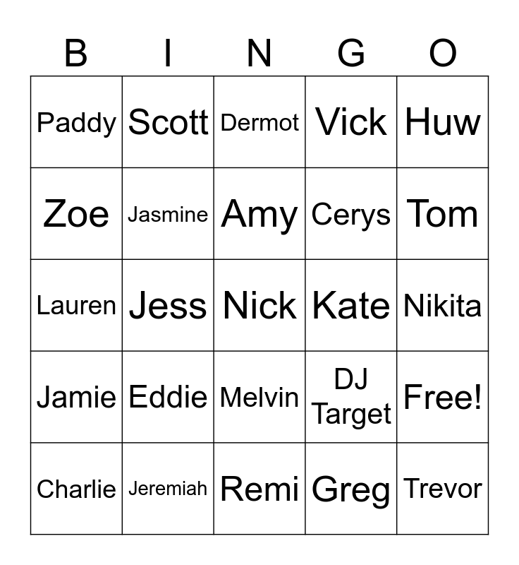 This bingo card has 26 words: Melvin, Greg, Amy, Jeremiah, Huw, Paddy, Zoe, Scott, Nikita, DJ Target, Cerys, Lauren, Free!, Charlie, Jess, Craig, Vick, Jamie, Dermot, Nick, Tom, Remi, Kate, Eddie, Jasmine and Trevor.