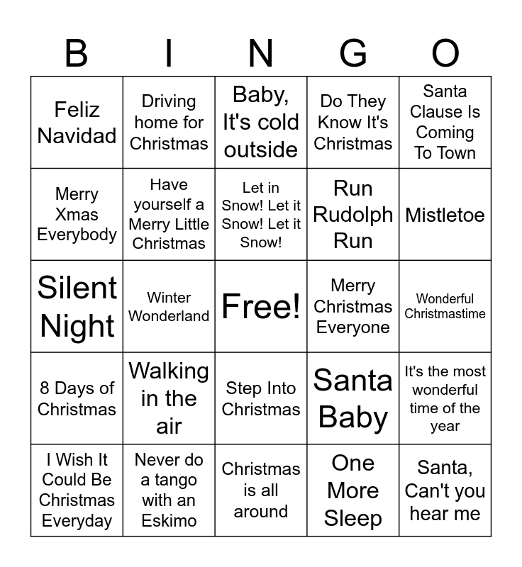 This bingo card has a free space and 35 words: All I want for Christmas is you, Fairytale of New York, Stay Another Day, Have yourself a Merry Little Christmas, Step Into Christmas, Do They Know It's Christmas, Merry Xmas Everybody, Rockin' Around the Christmas Tree, Let in Snow! Let it Snow! Let it Snow!, White Christmas, Silent Night, Santa Clause Is Coming To Town, I Saw Mommy Kissing Santa Claus, Last Christmas, Feliz Navidad, Merry Christmas Everyone, One More Sleep, Winter Wonderland, 8 Days of Christmas, Santa, Can't you hear me, Santa Baby, I Wish It Could Be Christmas Everyday, It's the most wonderful time of the year, Never do a tango with an Eskimo, Baby, It's cold outside, Mistletoe, Santa Tell me, Jingle Bell Rock, Run Rudolph Run, Wonderful Christmastime, Happy Xmas (War is over), Christmas is all around, Walking in the air, Driving home for Christmas and Christmas time (Don’t let the bells end).