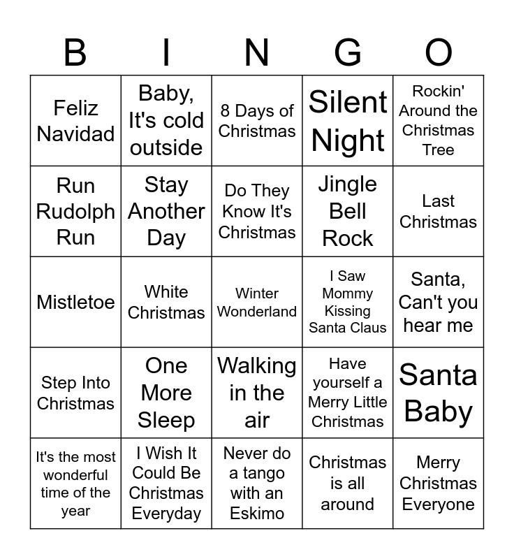 This bingo card has 36 words: Free!, All I want for Christmas is you, Fairytale of New York, Stay Another Day, Have yourself a Merry Little Christmas, Step Into Christmas, Do They Know It's Christmas, Merry Xmas Everybody, Rockin' Around the Christmas Tree, Let in Snow! Let it Snow! Let it Snow!, White Christmas, Silent Night, Santa Clause Is Coming To Town, I Saw Mommy Kissing Santa Claus, Last Christmas, Feliz Navidad, Merry Christmas Everyone, One More Sleep, Winter Wonderland, 8 Days of Christmas, Santa, Can't you hear me, Santa Baby, I Wish It Could Be Christmas Everyday, It's the most wonderful time of the year, Never do a tango with an Eskimo, Baby, It's cold outside, Mistletoe, Santa Tell me, Jingle Bell Rock, Run Rudolph Run, Wonderful Christmastime, Happy Xmas (War is over), Christmas is all around, Walking in the air, Driving home for Christmas and Christmas time (Don’t let the bells end).