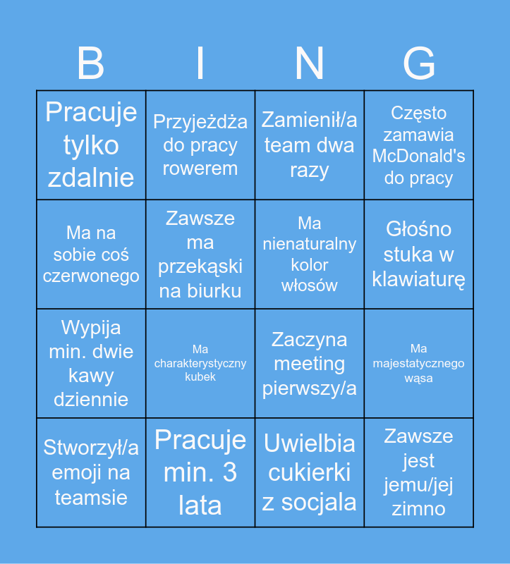 This bingo card has 16 words: Pracuje min. 3 lata, Ma majestatycznego wąsa, Zamienił/a team dwa razy, Pracuje tylko zdalnie, Wypija min. dwie kawy dziennie, Przyjeżdża do pracy rowerem, Zaczyna meeting pierwszy/a, Uwielbia cukierki z socjala, Ma na sobie coś czerwonego, Zawsze ma przekąski na biurku, Stworzył/a emoji na teamsie, Często zamawia McDonald's do pracy, Ma charakterystyczny kubek, Głośno stuka w klawiaturę, Ma nienaturalny kolor włosów and Zawsze jest jemu/jej zimno.