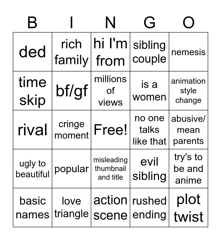 This bingo card has a free space and 24 words: popular, love triangle, millions of views, basic names, nemesis, ded, time skip, rich family, no one talks like that, misleading thumbnail and title, is a women, rival, evil sibling, try's to be and anime, bf/gf, rushed ending, abusive/ mean parents, hi I'm from, animation style change, cringe moment, plot twist, ugly to beautiful, sibling couple and action scene.