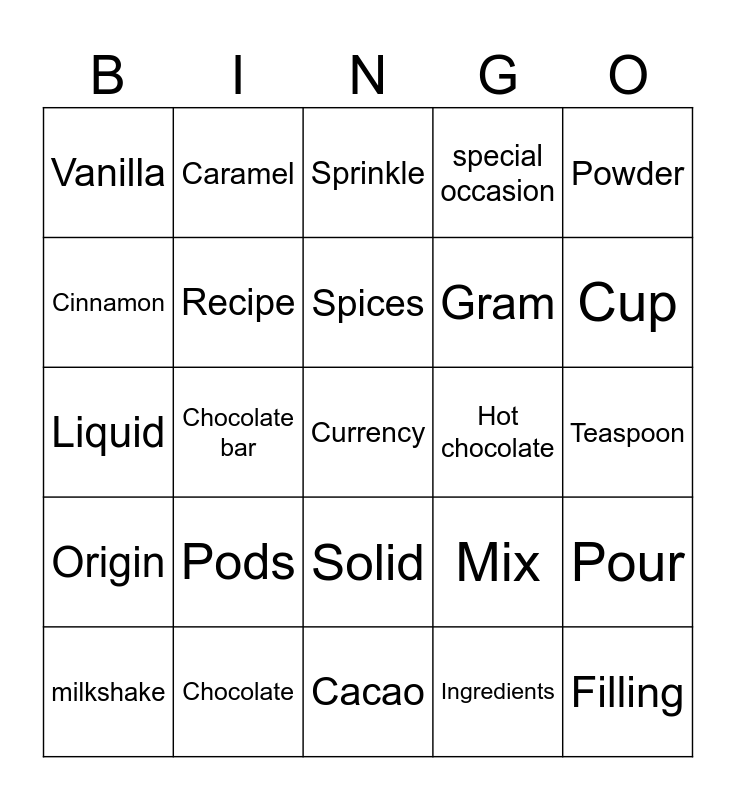This bingo card has a free space and 24 words: Pods, Chocolate, Spices, milkshake, Powder, Vanilla, Cinnamon, Caramel, Hot chocolate, Solid, Gram, Liquid, Mix, Pour, Recipe, Ingredients, Teaspoon, Sprinkle, Cup, Chocolate bar, Filling, Origin, special occasion and Cacao.