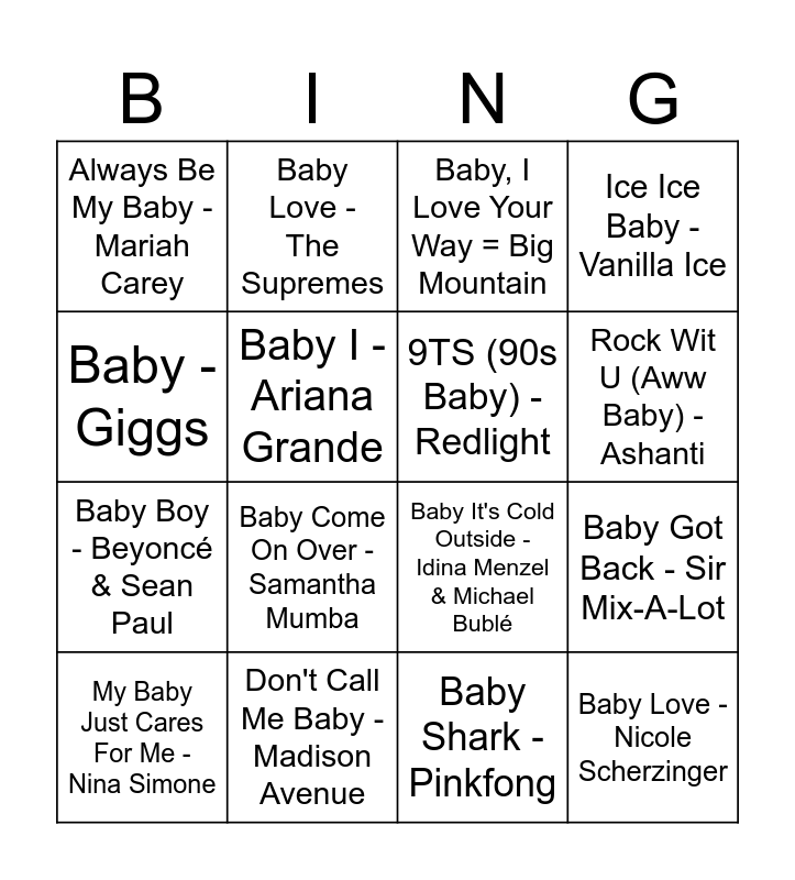 This bingo card has 26 words: Free!, Baby - Justin Bieber, Rock Wit U (Aww Baby) - Ashanti, Baby Boy - Big Brovaz, Baby - Giggs, Always Be My Baby - Mariah Carey, Baby I - Ariana Grande, Baby Love - The Supremes, Baby Shark - Pinkfong, Babycakes - 3 Of A Kind, Baby Boy - Beyoncé & Sean Paul, Baby It's Cold Outside - Idina Menzel & Michael Bublé, Baby It's You - JoJo, Baby - Aitch, Baby Got Back - Sir Mix-A-Lot, Runaway Baby - Bruno Mars, Ice Ice Baby - Vanilla Ice, Baby Love - Nicole Scherzinger, Baby, I Love Your Way = Big Mountain, My Baby Just Cares For Me - Nina Simone, Baby Come On Over - Samantha Mumba, Hey Baby (Uhh Ahh) - DJ Otzi, Don't Call Me Baby - Madison Avenue, Baby By Me - 50 Cent & Ne-Yo, 9TS (90s Baby) - Redlight and No More (Baby I'ma Do Right) - 3LW.