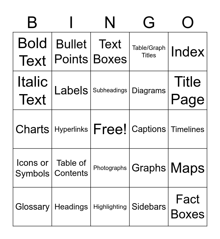This bingo card has a free space and 24 words: Table of Contents, Headings, Subheadings, Glossary, Index, Bold Text, Italic Text, Bullet Points, Captions, Photographs, Diagrams, Charts, Graphs, Maps, Labels, Sidebars, Timelines, Text Boxes, Title Page, Hyperlinks, Fact Boxes, Icons or Symbols, Table/Graph Titles and Highlighting.
