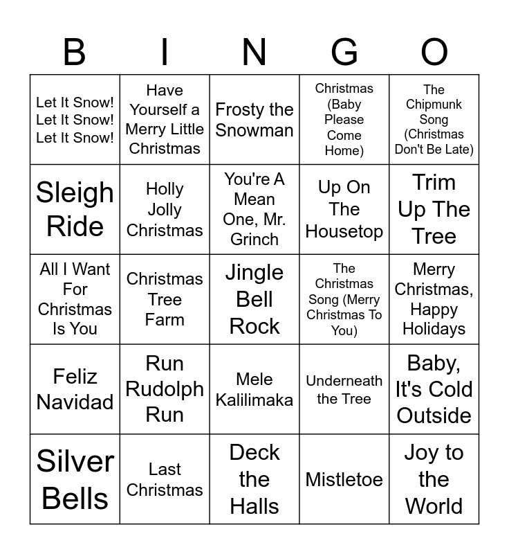 This bingo card has 40 words: Free!, All I Want For Christmas Is You, Rockin' Around the Christmas Tree, Holly Jolly Christmas, Last Christmas, Mele Kalilimaka, You're A Mean One, Mr. Grinch, Christmas Time Is Here, The Chipmunk Song (Christmas Don't Be Late), Feliz Navidad, Christmas Tree Farm, Christmas (Baby Please Come Home), Jingle Bell Rock, Merry Christmas, Happy Holidays, The Christmas Song (Merry Christmas To You), Run Rudolph Run, It's the Most Wonderful Time of the Year, Let It Snow! Let It Snow! Let It Snow!, It's Beginning to Look a Lot Like Christmas, Frosty the Snowman, Baby, It's Cold Outside, Mistletoe, Up On The Housetop, Sleigh Ride, Carol of the Bells, Little Saint Nick, What Christmas Means To Me, Little Drummer Boy, Joy to the World, Do You Hear What I Hear?, Dance of the Sugar Plum Fairy, Silver Bells, Winter Wonderland, Underneath the Tree, Trim Up The Tree, Deck the Halls, We Need a Little Christmas, Step Into Christmas, Have Yourself a Merry Little Christmas and Rudolph the Red-Nosed Reindeer.