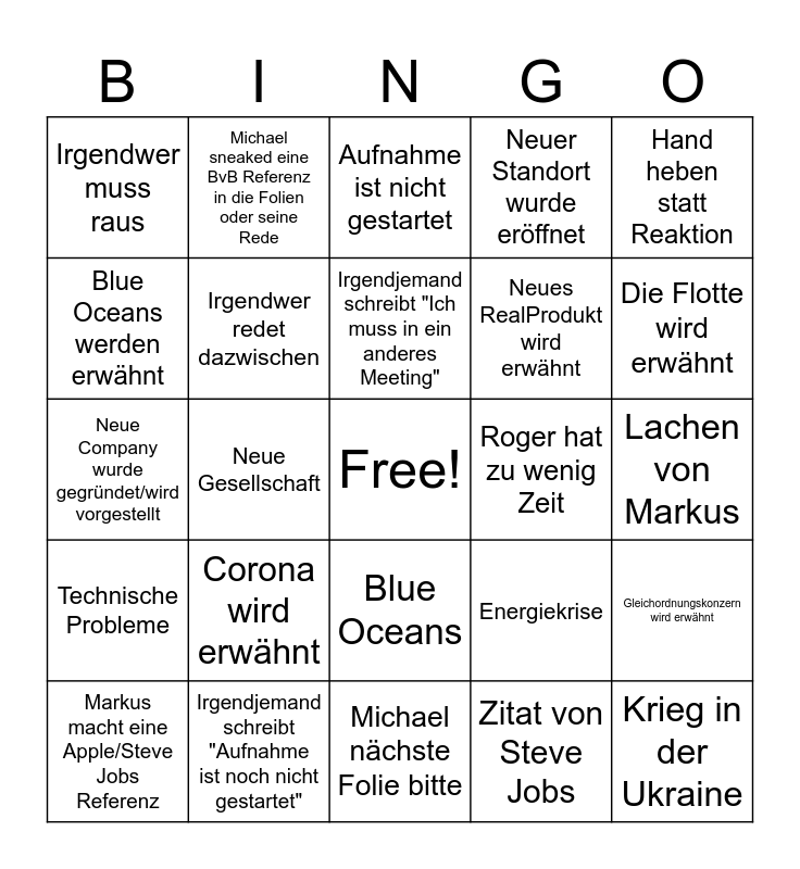 This bingo card has a free space and 31 words: Michael nächste Folie bitte, Apple wird erwähnt, Neue Gesellschaft, Neuer Geschäftsführer, Irgendwer muss raus, Aufnahme ist nicht gestartet, Irgendwer redet dazwischen, Energiekrise, Roger hat zu wenig Zeit, Zitat von Steve Jobs, Lachen von Markus, Krieg in der Ukraine, Meeting beginnt mit Fußball, Mindestens 20 Leute schreiben "danke", Die Flotte wird erwähnt, Magna Carta wird erwähnt, Gleichordnungskonzern wird erwähnt, Corona wird erwähnt, Technische Probleme, Blue Oceans, Hand heben statt Reaktion, Falsch geschriebene Namen, Markus macht eine Apple/Steve Jobs Referenz, Michael sneaked eine BvB Referenz in die Folien oder seine Rede, Neues RealProdukt wird erwähnt, Blue Oceans werden erwähnt, Neuer Standort wurde eröffnet, Neue Company wurde gegründet/wird vorgestellt, Irgendjemand schreibt "Aufnahme ist noch nicht gestartet", Irgendjemand schreibt "Ich muss in ein anderes Meeting" and CDDP.