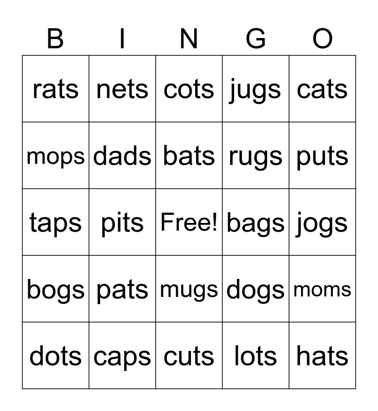 This bingo card has a free space and 24 words: pats, caps, bats, dots, cats, rats, mops, nets, bags, mugs, rugs, taps, dogs, moms, dads, lots, jogs, cots, puts, pits, hats, bogs, jugs and cuts.