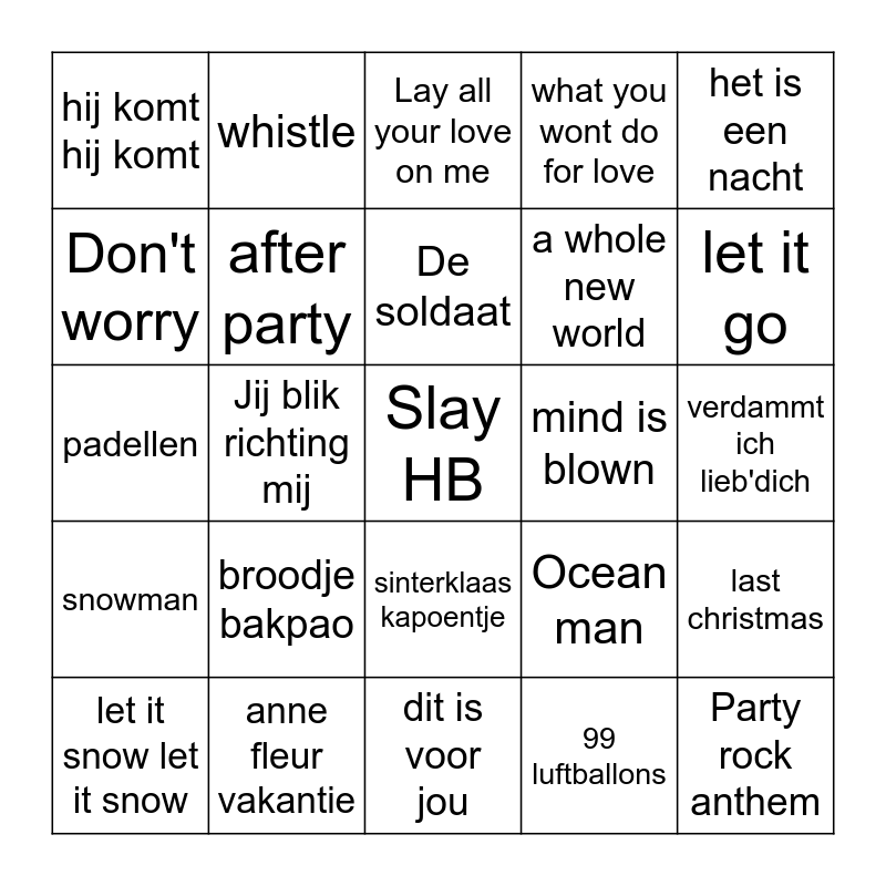 This bingo card has a free space and 76 words: Zie ginds komt de stoomboot, Terug in de tijd, Lay all your love on me, All star, Ghost, J'ai mangé un croissant et Maintenent il est absent, Super trouper, September, I'm just Ken, Axel F, Memories, Ijskoud, De soldaat, Don't worry, Als jij je vinger in mn kont steekt, Jij blik richting mij, Don't stop the music, Party rock anthem, Ik neem je mee, het is een nacht, Vluchtstrook, padellen, after party, whistle, what you wont do for love, I like to move it, Peaches, Rocket man, Sh-boom, Rasputin, This girl, Im a believer, Lemon tree, Ocean man, let it go, a whole new world, circle of life, mamma mia, verdammt ich lieb'dich, 99 luftballons, atemlos durch die nacht, mee naar diemen-zuid, Non Non rien n'a changé, ists beginning to look a lot like xmas, Rocking around the christmas tree, jingle bell rock, let it snow let it snow, hij komt hij komt, walking on a dream, just dance, blinding lights, sinterklaas kapoentje, sinterklaas kom maar binnen, sinterklaar wie kent hem niet, hoor de wind waait door de bomen, hoor wie klopt daar kinderen, zie de maan schijn door de bomen, de zak van sinterklaas, sinterklaas is jarig, olivia, broodje bakpao, meet me halfway, fuifje, physical, mooi van ver, stiekem, mind is blown, heaven, mistletoe, all i want for christmas, last christmas, snowman, anne fleur vakantie, maneater, dit is voor jou and jij hoort bij ons.