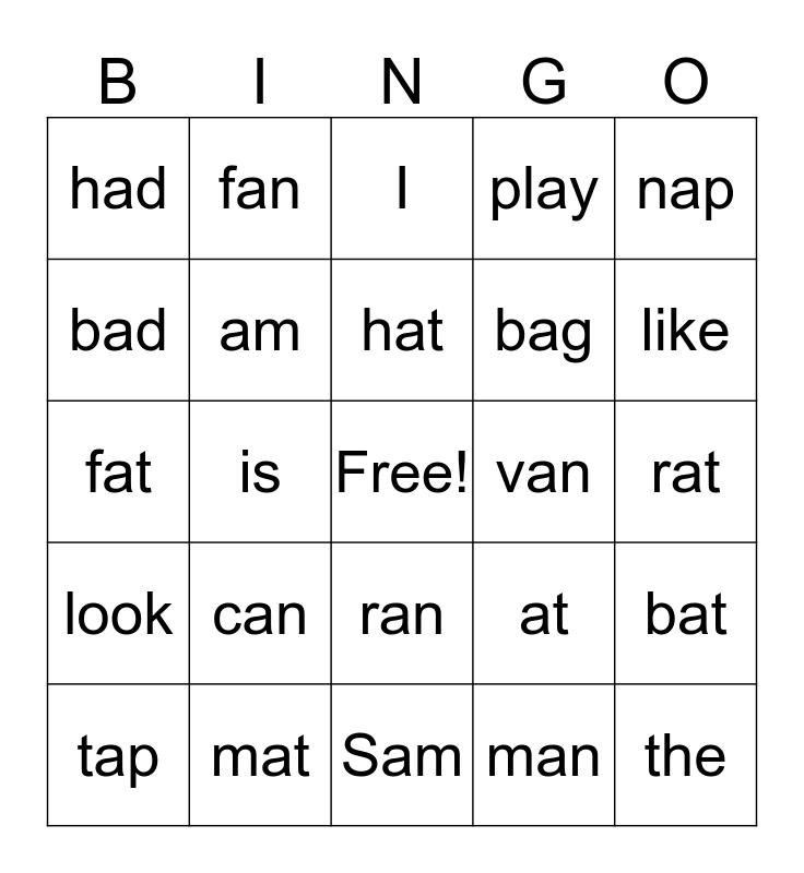 This bingo card has a free space and 24 words: can, mat, hat, tap, nap, had, bad, fan, van, ran, bag, fat, at, bat, am, man, rat, I, like, is, the, look, play and Sam.