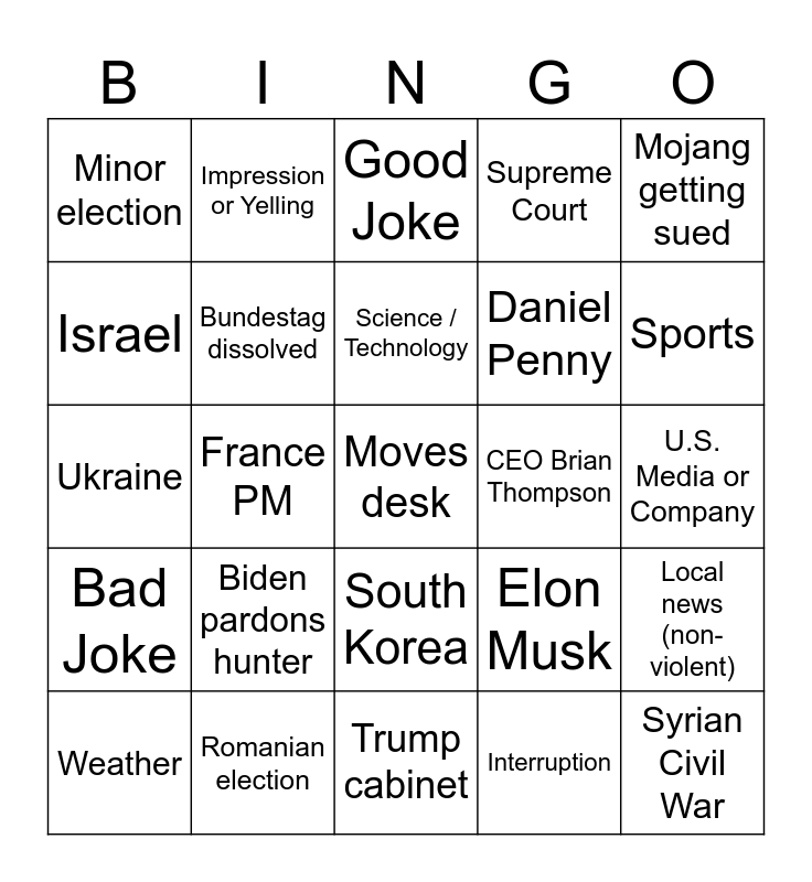 This bingo card has a free space and 29 words: Weather, Matt Gaetz, France PM, Bitcoin / Crypto, Minor election, Good Joke, Bundestag dissolved, Biden pardons hunter, CEO Brian Thompson, Romanian election, U.S. Media or Company, Syrian Civil War, Trump cabinet, Interruption, Sports, Trump (non-cabinet), South Korea, Bad Joke, Mojang getting sued, Ukraine, Elon Musk, Local Violence, Daniel Penny, Israel, Supreme Court, Impression or Yelling, Local news (non-violent), Science / Technology and Environment.