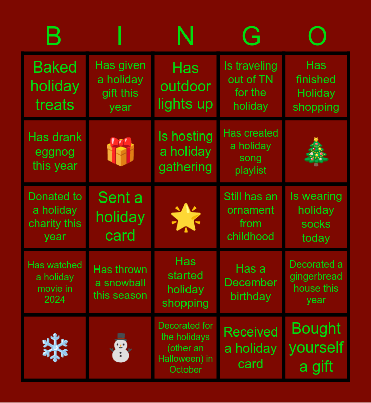 This bingo card has a free space and 27 words: Has a December birthday, Is wearing a holiday themed shirt, Has created a holiday song playlist, Decorated for the holidays (other an Halloween) in October, Has drank eggnog this year, Has outdoor lights up, Has given a holiday gift this year, Has watched a holiday movie in 2024, Still has an ornament from childhood, Decorated a gingerbread house this year, Donated to a holiday charity this year, Is traveling out of TN for the holiday, ❄️, ⛄, 🎄, 🔔, 🎁, Is hosting a holiday gathering, Has thrown a snowball this season, Baked holiday treats, Is wearing holiday socks today, Received a holiday card, Sent a holiday card, Bought yourself a gift, Has started holiday shopping, Has finished Holiday shopping and 🕎.