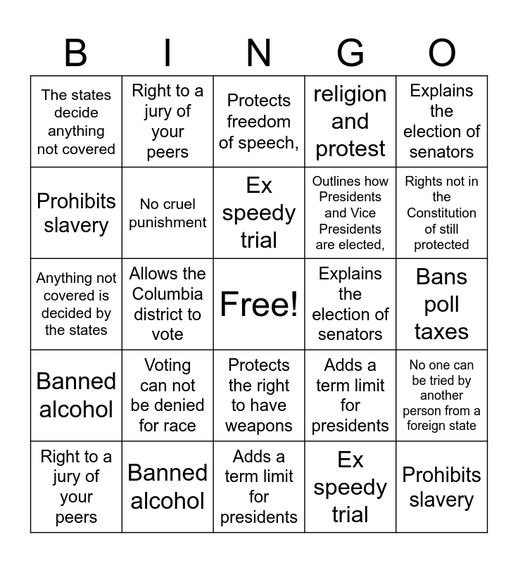 This bingo card has a free space and 54 words: Provides equal rights to all citizens of the us, Voting can not be denied for race, Allows Congress to pass taxes, Overrules the 18th amendment, Bans poll taxes, Gave women the right to vote, No cruel punishment, Protects freedom of speech,, religion and protest, Rights not in the Constitution of still protected, The states decide anything not covered, Rights of accused during trial, Ex speedy trial, No one can be tried by another person from a foreign state, Protects citizens from unlawful searches, Proctors the right of the accused ex no double jeopardy, Protects the right to have weapons, Outlines how Presidents and Vice Presidents are elected,, Protects your ability to not house soldiers, Prohibits slavery, Banned alcohol, Allows the Columbia district to vote, Adds a term limit for presidents, Explains the election of senators, Sets the succession order for the president, Right to a jury of your peers, Puts the voting age to 18, Provides equal rights to all citizens of the us, Voting can not be denied for race, Allows Congress to pass taxes, Overrules the 18th amendment, Bans poll taxes, Gave women the right to vote, No cruel punishment, Protects freedom of speech,, religion and protest, Rights not in the Constitution of still protected, Anything not covered is decided by the states, Rights of accused during trial, Ex speedy trial, No one can be tried by another person from a foreign state, Protects citizens from unlawful searches, Proctors the right of the accused ex no double jeopardy, Protects the right to have weapons, Outlines how Presidents and Vice Presidents are elected,, Protects your ability to not house soldiers, Prohibits slavery, Banned alcohol, Allows the Columbia district to vote, Adds a term limit for presidents, Explains the election of senators, Sets the succession order for the president, Right to a jury of your peers and Puts the voting age to 18.