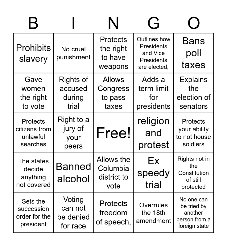 This bingo card has a free space and 27 words: Provides equal rights to all citizens of the us, Voting can not be denied for race, Allows Congress to pass taxes, Overrules the 18th amendment, Bans poll taxes, Gave women the right to vote, No cruel punishment, Protects freedom of speech,, religion and protest, Rights not in the Constitution of still protected, The states decide anything not covered, Rights of accused during trial, Ex speedy trial, No one can be tried by another person from a foreign state, Protects citizens from unlawful searches, Proctors the right of the accused ex no double jeopardy, Protects the right to have weapons, Outlines how Presidents and Vice Presidents are elected,, Protects your ability to not house soldiers, Prohibits slavery, Banned alcohol, Allows the Columbia district to vote, Adds a term limit for presidents, Explains the election of senators, Sets the succession order for the president, Right to a jury of your peers and Puts the voting age to 18.