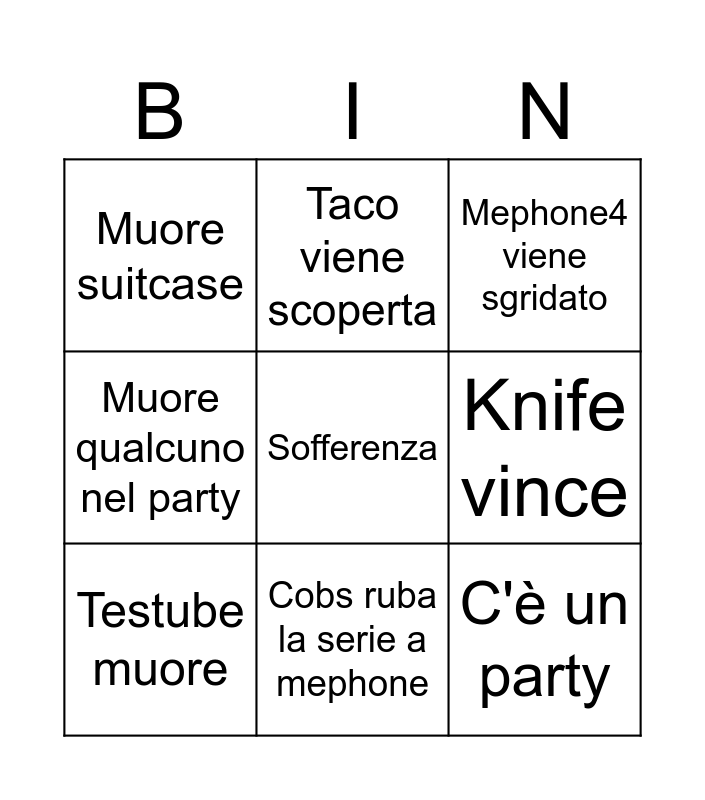 This bingo card has a free space and 8 words: Knife vince, Mephone4 viene sgridato, Taco viene scoperta, Testube muore, Muore suitcase, C'è un party, Muore qualcuno nel party and Cobs ruba la serie a mephone.