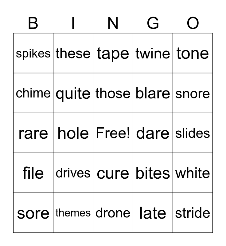 This bingo card has a free space and 32 words: late, kite, hole, gave, file, quite, tone, white, these, whale, those, tape, bone, fire, dare, square, sore, rare, cure, drives, bites, moles, slides, themes, stride, twine, blare, chime, spikes, drone, bride and snore.