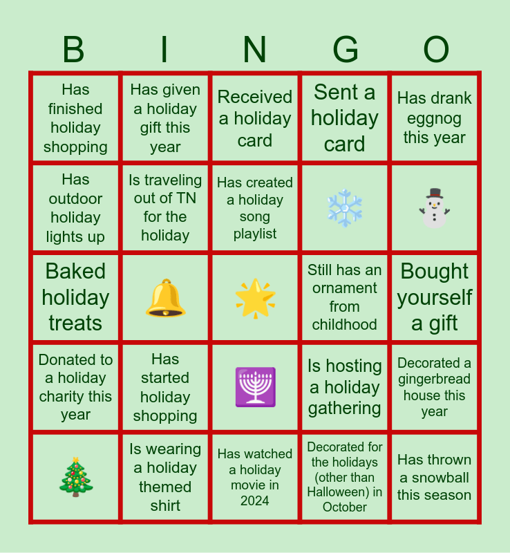 This bingo card has a free space and 27 words: Has a December birthday, Is wearing a holiday themed shirt, Has created a holiday song playlist, Decorated for the holidays (other than Halloween) in October, Has drank eggnog this year, Has outdoor holiday lights up, Has given a holiday gift this year, Has watched a holiday movie in 2024, Still has an ornament from childhood, Decorated a gingerbread house this year, Donated to a holiday charity this year, Is traveling out of TN for the holiday, Is hosting a holiday gathering, Has thrown a snowball this season, Baked holiday treats, Is wearing holiday socks today, Received a holiday card, Sent a holiday card, Bought yourself a gift, Has finished holiday shopping, Has started holiday shopping, 🕎, ❄️, ⛄, 🎄, 🔔 and 🎁.