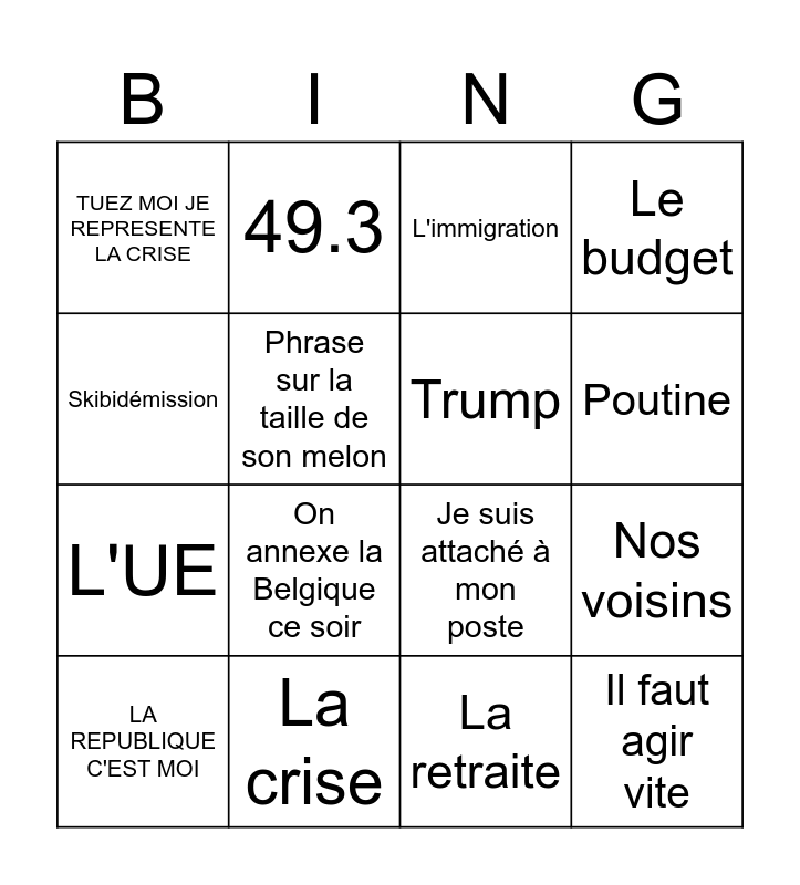 This bingo card has 16 words: La crise, Nos voisins, L'immigration, TUEZ MOI JE REPRESENTE LA CRISE, L'UE, 49.3, Je suis attaché à mon poste, La retraite, Skibidémission, Phrase sur la taille de son melon, LA REPUBLIQUE C'EST MOI, Le budget, On annexe la Belgique ce soir, Poutine, Trump and Il faut agir vite.