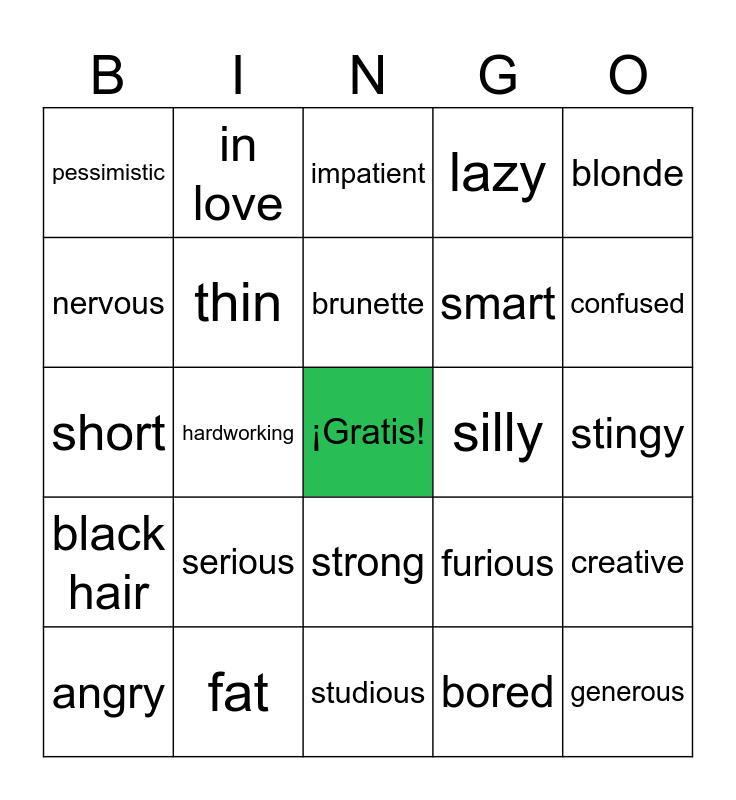 This bingo card has a free space and 41 words: tall, short, bald, thin, fat, strong, brunette, red-haired, blonde, black hair, hardworking, lazy, generous, stingy, silly, serious, optimistic, pessimistic, patient, impatient, creative, spontaneous, studious, smart, sincere, shy, bored, jealous, confused, happy, excited, in love, angry, frustrated, furious, nervous, surprised, calm, sad, tired and scared.
