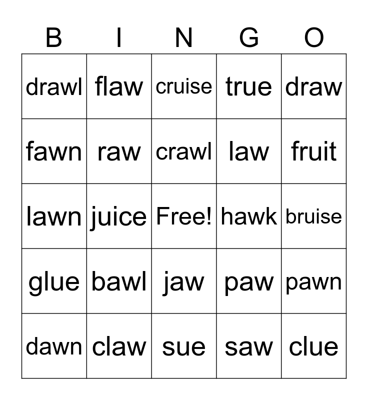This bingo card has a free space and 24 words: bawl, claw, crawl, dawn, draw, drawl, fawn, flaw, hawk, jaw, law, lawn, paw, pawn, raw, saw, bruise, cruise, fruit, juice, clue, glue, true and sue.