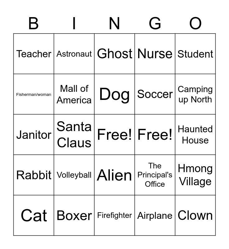 This bingo card has a free space and 25 words: Volleyball, Firefighter, Dog, Cat, Student, Teacher, Fisherman/woman, Astronaut, Free!, Alien, Soccer, Janitor, The Principal's Office, Hmong Village, Mall of America, Ice Skating Rink, Haunted House, Ghost, Camping up North, Santa Claus, Clown, Boxer, Rabbit, Nurse and Airplane.