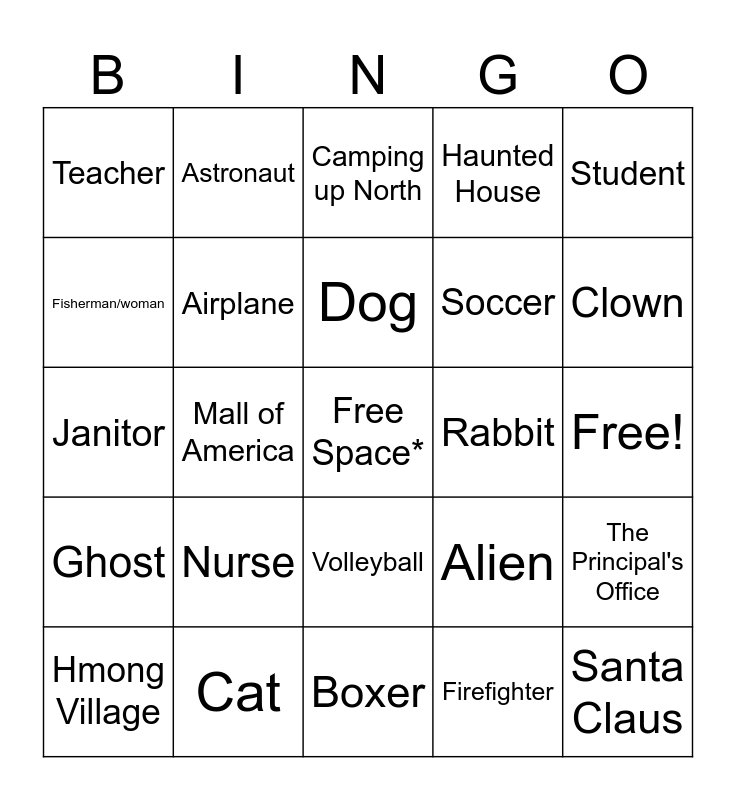 This bingo card has a free space and 26 words: Volleyball, Firefighter, Dog, Cat, Student, Teacher, Fisherman/woman, Astronaut, Free!, Alien, Soccer, Janitor, The Principal's Office, Hmong Village, Mall of America, Ice Skating Rink, Haunted House, Ghost, Camping up North, Santa Claus, Clown, Boxer, Rabbit, Nurse, Airplane and Goat.