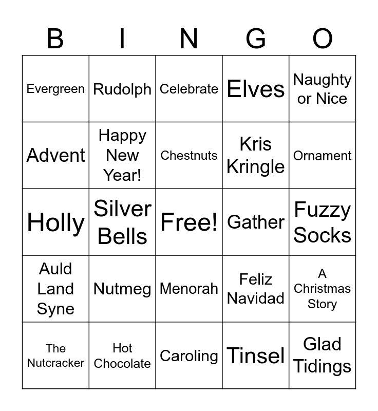 This bingo card has a free space and 72 words: Give, Rudolph, Silver Bells, Nativity, Happy Holidays, 12 Days of Christmas, Elves, Jingle Bells, Kris Kringle, Die Hard, The Nutcracker, Candy Cane, Ornament, Evergreen, Glitter, Holly, Feliz Navidad, Naughty or Nice, Cookies, Fuzzy Socks, Nutmeg, Glad Tidings, A Christmas Story, Wreath, Merry, Deck the Halls!, Christmas Tree, Kwanzaa, Coal, Poinsettia, Hot Chocolate, Sledding, North Pole, Mistletoe, Tinsel, Peace on Earth, Winter Solstice, Season's Greetings, Advent, Wassail, Menorah, Garland, Figgy Pudding, Karamu (Kwanzaa Celebration), Stocking, Auld Land Syne, Lights, Joy to the World, Frosty the Snowman, Silent Night, Noel, Miracle on 34th Street, Travel, Gather, Eggnog, Snow, Celebrate, Chestnuts, Fruitcake, Star, Pine, Grinch, Gingerbread, Caroling, Scrooge, Christmas, Happy New Year!, Dreidel, Christmas Vacation, Jack Frost, Hanukah and Latkes.