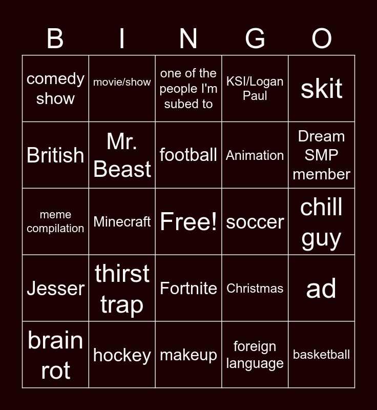 This bingo card has a free space and 24 words: brain rot, thirst trap, football, foreign language, skit, comedy show, movie/show, one of the people I'm subed to, soccer, chill guy, meme compilation, Mr. Beast, Christmas, ad, British, hockey, makeup, KSI/Logan Paul, Dream SMP member, Jesser, Minecraft, Fortnite, Animation and basketball.