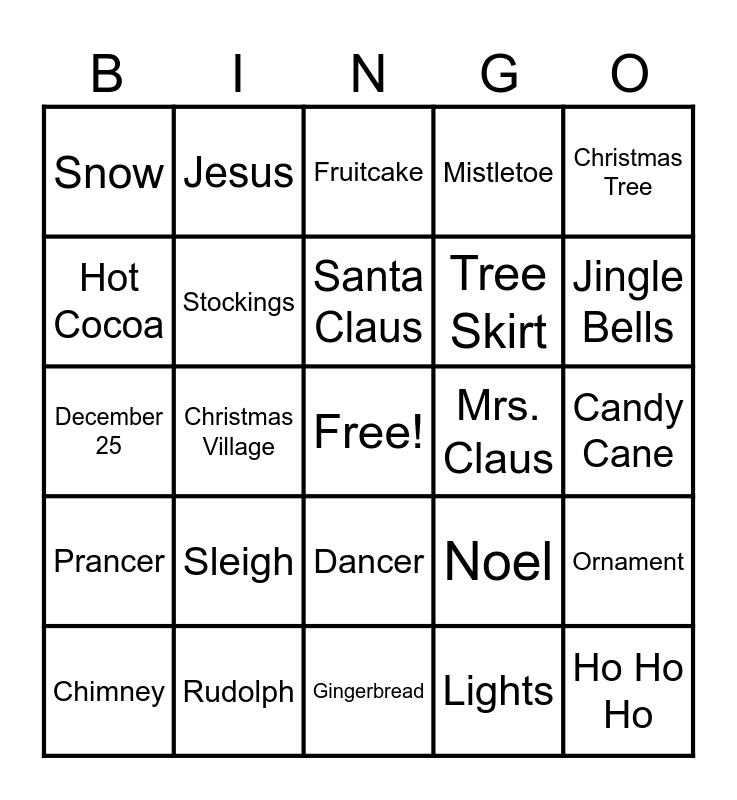 This bingo card has a free space and 47 words: Merry Christmas, Ho Ho Ho, Reindeer, Gingerbread, Sleigh, Angel, Jesus, Egg Nog, Hot Cocoa, Presents, Stockings, Mistletoe, Ornament, Noel, Wrapping Paper, Pinecone, Santa Claus, Mrs. Claus, The Grinch, Christmas Tree, Christmas Village, Lights, Snow, Tree Skirt, Tree Topper, Jingle Bells, Chimney, Dasher, Dancer, Prancer, Vixon, Comet, Cupid, Donner, Blitzen, Rudolph, Candy Cane, Mulled Cider, Kris Kringle, Nutcracker, Wreath, Fruitcake, December 25, Yuletide, North Pole, Christmas Cards and Elf.
