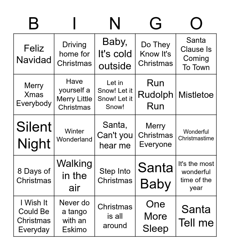This bingo card has 35 words: All I want for Christmas is you, Fairytale of New York, Stay Another Day, Have yourself a Merry Little Christmas, Step Into Christmas, Do They Know It's Christmas, Merry Xmas Everybody, Rockin' Around the Christmas Tree, Let in Snow! Let it Snow! Let it Snow!, White Christmas, Silent Night, Santa Clause Is Coming To Town, I Saw Mommy Kissing Santa Claus, Last Christmas, Feliz Navidad, Merry Christmas Everyone, One More Sleep, Winter Wonderland, 8 Days of Christmas, Santa, Can't you hear me, Santa Baby, I Wish It Could Be Christmas Everyday, It's the most wonderful time of the year, Never do a tango with an Eskimo, Baby, It's cold outside, Mistletoe, Santa Tell me, Jingle Bell Rock, Run Rudolph Run, Wonderful Christmastime, Happy Xmas (War is over), Christmas is all around, Walking in the air, Driving home for Christmas and Christmas time (Don’t let the bells end).