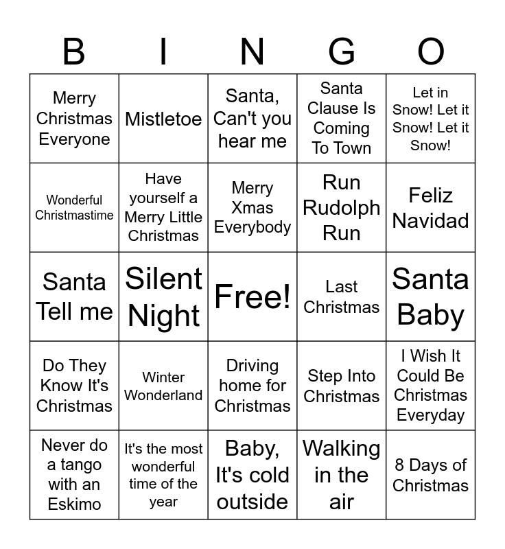 This bingo card has a free space and 36 words: All I want for Christmas is you, Fairytale of New York, Stay Another Day, Have yourself a Merry Little Christmas, Step Into Christmas, Do They Know It's Christmas, Merry Xmas Everybody, Rockin' Around the Christmas Tree, Let in Snow! Let it Snow! Let it Snow!, White Christmas, Silent Night, Santa Clause Is Coming To Town, I Saw Mommy Kissing Santa Claus, Last Christmas, Feliz Navidad, Merry Christmas Everyone, One More Sleep, Winter Wonderland, 8 Days of Christmas, Santa, Can't you hear me, Santa Baby, I Wish It Could Be Christmas Everyday, It's the most wonderful time of the year, Never do a tango with an Eskimo, Baby, It's cold outside, Mistletoe, Santa Tell me, Jingle Bell Rock, Run Rudolph Run, Wonderful Christmastime, Happy Xmas (War is over), Christmas is all around, Walking in the air, Driving home for Christmas, Christmas time (Don’t let the bells end) and Christmas (Baby please come home).