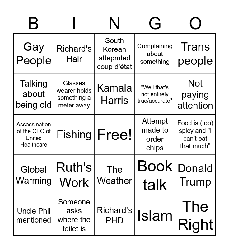 This bingo card has a free space and 46 words: The Left / Lefty, The Right, Immigrants, Richard's PHD, Ruth's Work, Richard not getting a job, Richard's Hair, Cruises, Talking about being old, Glasses, Glasses wearer holds something a meter away, Complaining about something, Donald Trump, Book talk, Russia/Ukraine, Israel/Palestine, Kamala Harris, Attempt made to order chips, Streaming Service Show, Trans people, Fishing, Islam, Gay People, "Well that's not entirely true/accurate", "I'm sorry but ...", Not paying attention, Uncle Phil mentioned, Christmas / New Years plans, The Weather, Global Warming, Conspiracy Theory, Wacky Conspiracy Theory, Someone tries to guess a square, Nana mentions "It's past my bedtime", Alcoholism (> 3 pints), Someone asks where the toilet is, Food is (too) spicy and "I can't eat that much", TV licence, Someone needs something fixed, Someone says things just to guess squares, Richard's New Printer, South Korean attepmted coup d'état, Assassination of the CEO of United Healthcare, Hunter Biden Pardon, French / German Government Collapse and Elon Musk / Department of Government Efficiency.
