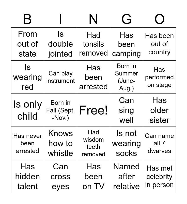 This bingo card has a free space and 24 words: Knows how to whistle, Can cross eyes, Has been arrested, Has hidden talent, Has been out of country, From out of state, Is wearing red, Is double jointed, Can sing well, Had wisdom teeth removed, Born in Summer (June-Aug.), Is only child, Is not wearing socks, Can name all 7 dwarves, Can play instrument, Named after relative, Has older sister, Had tonsils removed, Has performed on stage, Born in Fall (Sept. -Nov.), Has met celebrity in person, Has never been arrested, Has been camping and Has been on TV.