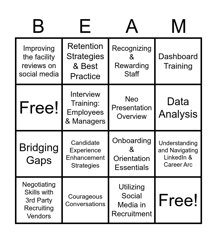 This bingo card has 16 words: Courageous Conversations, Understanding and Navigating LinkedIn & Career Arc, Recognizing & Rewarding Staff, Improving the facility reviews on social media, Bridging Gaps, Retention Strategies & Best Practice, Onboarding & Orientation Essentials, Utilizing Social Media in Recruitment, Free!, Interview Training: Employees & Managers, Negotiating Skills with 3rd Party Recruiting Vendors, Dashboard Training, Candidate Experience Enhancement Strategies, Data Analysis, Neo Presentation Overview and Free!.