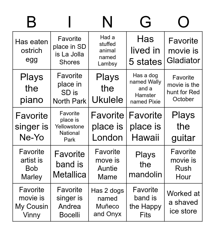 This bingo card has 26 words: Favorite move is Auntie Mame, Favorite band is the Happy Fits, Plays the Ukulele, Favorite singer is Andrea Bocelli, Favorite movie is Gladiator, Has eaten ostrich egg, Plays the piano, Favorite place in SD is La Jolla Shores, Plays the guitar, Plays the mandolin, Has a dog named Wally and a Hamster named Pixie, Favorite singer is Ne-Yo, Favorite movie is Rush Hour, Favorite movie is My Cousin Vinny, Favorite place is Yellowstone National Park, Favorite movie is Moonstruck, Has lived in 5 states, Favorite artist is Bob Marley, Had a stuffed animal named Lambsy, Favorite place is London, Favorite movie is the hunt for Red October, Has 2 dogs named Muñeco and Onyx, Favorite place is Hawaii, Favorite band is Metallica, Favorite place in SD is North Park and Worked at a shaved ice store.