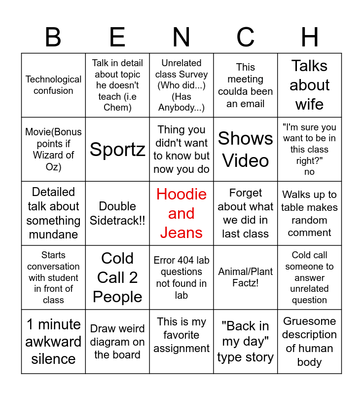 This bingo card has a free space and 24 words: 1 minute awkward silence, Cold Call 2 People, Thing you didn't want to know but now you do, "Back in my day" type story, Talks about wife, Technological confusion, Talk in detail about topic he doesn't teach (i.e Chem), Unrelated class Survey (Who did...) (Has Anybody...), Forget about what we did in last class, Walks up to table makes random comment, Detailed talk about something mundane, Sportz, Animal/Plant Factz!, Cold call someone to answer unrelated question, Movie(Bonus points if Wizard of Oz), Draw weird diagram on the board, This is my favorite assignment, This meeting coulda been an email, "I'm sure you want to be in this class right?" no, Starts conversation with student in front of class, Double Sidetrack!!, Error 404 lab questions not found in lab, Shows Video and Gruesome description of human body.
