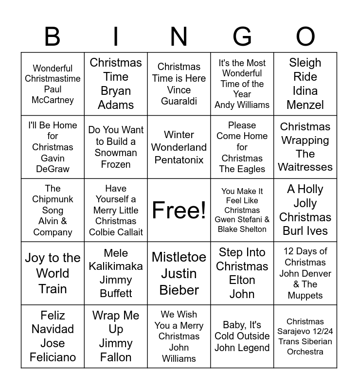 This bingo card has a free space and 24 words: Mele Kalikimaka Jimmy Buffett, Wrap Me Up Jimmy Fallon, Winter Wonderland Pentatonix, Feliz Navidad Jose Feliciano, Sleigh Ride Idina Menzel, Wonderful Christmastime Paul McCartney, I'll Be Home for Christmas Gavin DeGraw, Christmas Time Bryan Adams, You Make It Feel Like Christmas Gwen Stefani & Blake Shelton, Mistletoe Justin Bieber, Please Come Home for Christmas The Eagles, The Chipmunk Song Alvin & Company, Step Into Christmas Elton John, 12 Days of Christmas John Denver & The Muppets, Do You Want to Build a Snowman Frozen, Baby, It's Cold Outside John Legend, A Holly Jolly Christmas Burl Ives, Christmas Time is Here Vince Guaraldi, Christmas Wrapping The Waitresses, Have Yourself a Merry Little Christmas Colbie Callait, Christmas Sarajevo 12/24 Trans Siberian Orchestra, Joy to the World Train, It's the Most Wonderful Time of the Year Andy Williams and We Wish You a Merry Christmas John Williams.