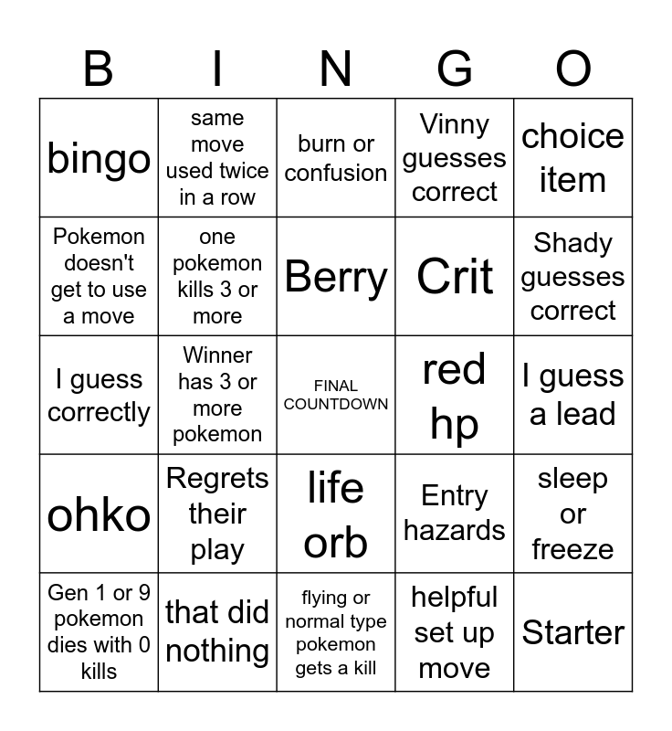 This bingo card has a free space and 24 words: Regrets their play, that did nothing, Berry, Gen 1 or 9 pokemon dies with 0 kills, choice item, bingo, Pokemon doesn't get to use a move, same move used twice in a row, red hp, life orb, Crit, I guess correctly, Entry hazards, sleep or freeze, one pokemon kills 3 or more, helpful set up move, I guess a lead, burn or confusion, Shady guesses correct, Winner has 3 or more pokemon, Starter, ohko, Vinny guesses correct and flying or normal type pokemon gets a kill.